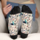 This William Morris Style was illustrated by me. I wanted to create a Hummingbird scene with whimsical flowers, branches and foliage dancing around. Cute little dragonflies fluttering around. Some of the flowers are Bleeding Hearts, Chrysanthemums and stylised wildflowers.  A wonderful pair of socks for a Spring or Summer day.