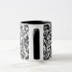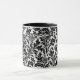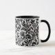Coffee mug in a vintage William Morris damask pattern of thistle flowers and leaves, in black, on a white background, digitally enhanced and coloured