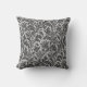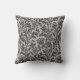 Throw pillow in a vintage William Morris damask pattern of thistle flowers and leaves, in deep graphite grey / grey, on a light silver grey background, digitally enhanced and coloured