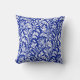 Throw pillow in a vintage William Morris damask pattern of thistle flowers and leaves, in white on a cobalt blue background, digitally enhanced and coloured