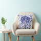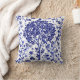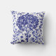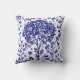 Throw pillow in a William Morris Art Nouveau take on a traditional "tree of life" pattern, featuring fantasy trees surrounded by branches filled with exotic flowers and birds, shades of rich cobalt blue and deep navy on a white background