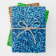 Wrapping paper in a vintage William Morris pattern of stylised willow branches, in cobalt and sky blue on a dark navy / indigo blue background, light to deep jade green on a dark emerald green background, and bronze, tan, and cream, on a dark chocolate brown background
