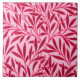 Tile in a William Morris Art Nouveau textile pattern of stylised willow branches and leaves in shades of burgundy / maroon and fuchsia pink, on a pastel pink background