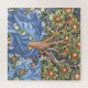 It shows a woodpecker sitting in the branch of a fruit tree and features a distinctive ornate background of blue leaves and orange fruit.