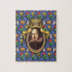 The Bard - On this puzzle is a portrait of the author William Shakespeare. The portrait is in an ornate oval gold frame with ribbons and a crown on top. The blue background wallpaper is decorated with castles, kings' crowns and yellow and red flowers, bringing to mind the romance, tragedy and comedy of his plays and poetry.