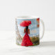 A graceful woman with a red umbrella strolls towards the Eiffel Tower in a soft autumn breeze. Romantic Parisian charm in glowing red and gold tones.