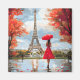 A graceful woman with a red umbrella strolls towards the Eiffel Tower in a soft autumn breeze. Romantic Parisian charm in glowing red and gold tones.