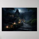 Digital artwork of a winding cobblestone path through a deep valley in moonlight and lit by lanterns up to ancient Chinese temples atop rock outcroppings.