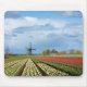 Mousepad with a landscape with a windmill and yellow and red tulips under a cloudy sky in the Dutch countryside on a beautiful springtime day in the Bulb Region, the Netherlands.