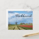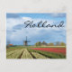 Postcard of a landscape with a windmill and yellow and red tulips under a cloudy sky in the Dutch countryside on a beautiful springtime day in the Bulb Region, the Netherlans with the text: 'Holland'.