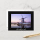 Postcard with a windmill during a purple sunrise in winter with a thin layer of snow and ice on the water at the UNESCO world heritage site Kinderdijk in the Netherlands with a black border and the text: 'Holland'.