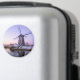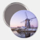 Round fridge magnet for a souvenir of a windmill during a purple sunrise in winter with a thin layer of snow and ice on the water at the UNESCO world heritage site Kinderdijk in the Netherlands.