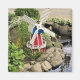 Very cute windmill garden decoration next to a pond. You can see the reflection in the water. Photo taken April 2019 in Woodburn, Oregon.