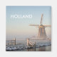 Square fridge magnet of a traditional dutch windmill covered in snow in a rural landscape in Aarlanderveen, the Netherlands, in winter in the warm early morning light at sunrise. A great souvenir with the text: 'HOLLAND'!