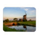 Rectangular souvenir photo magnet with a windmill next to a small ditch with a bridge at the edge of a big meadow in the dutch countryside at sunset in Aarlanderveen, the Netherlands.