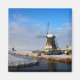Souvenir photo magnet with a windmill next to a small river in the sunlight of a cold winter morning in a dutch countryside landscape with snow in the Netherlands.