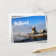 Photo postcard with a windmill next to a small river in the sunlight of a cold winter morning in a dutch countryside landscape with snow in the Netherlands with a white edge and in white the text 'Holland'. The image is a bit rotated to create the illusion of it laying loose.