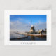 Photo postcard of a windmill next to a small river in the sunlight of a cold winter morning in a dutch countryside landscape with snow in the Netherlands with a white border and the text 'Holland'.