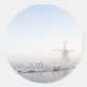 Round photo sticker with a windmill in the snow next to a canal during a foggy sunrise in winter in the Netherlands