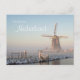 Postcard of a traditional dutch windmill covered in snow in a rural landscape in Aarlanderveen, the Netherlands, in winter in the warm early morning light at sunrise with the dutch text: "Groetjes uit Nederland", meaning 'Greetings from the Netherlands'.