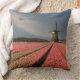 Photo throw pillow cushion with a landscape with a windmill and pink tulip flowers in rows on a bulb farm under a grey sky in the countryside in the Netherlands in spring.