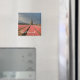Souvenir photo magnet of a landscape with a windmill and pink tulip flowers in rows on a bulb farm under a grey sky in the countryside in the Netherlands in spring with the text 'Holland'.