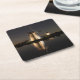 Coaster with a landscape with multiple windmills, illuminated at night, with reflection in the still canal water in Kinderdijk, the Netherlands.