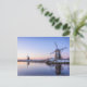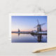 Postcard of a sunrise over the windmills of Kinderdijk in the Netherlands in winter with some snow and ice on the water of the river.