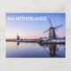 Postcard of a sunrise over the windmills of Kinderdijk in the Netherlands in winter with some snow and ice on the water with the text: 'The Netherlands'.