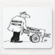 A window cleaner has his own window cleaning business and is pushing his barrow, or cart, with a ladder and bucket. On the back of his jacket he has the words Managing Director. Funny cartoon by UK cartoonist, Nigel Sutherland