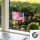 Window cling showing "Support Democracy" vertical