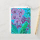 Postcard featuring вelicate floral painting based on life sketch. Window garden - beautiful orchid flower, triangled leaves of oxalis and some succulents on background. Colour palette: purple, violet, lylac, lavender, teal, green and blue colours