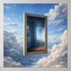 A floating window in the sky reveals an interior room where rain falls upward.