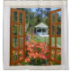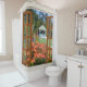 A series of shower curtains with a scene of outdoor landscape seen through multi-paned window with curtains. Give your bathroom the airy look of a picture window with beautiful scenery.