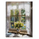Window with lace curtain and tulips notebook