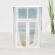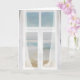 window with sheer curtain and ocean view card
