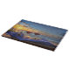 A stunning scene of two wine glasses on a beach at sunset, surrounded by candles and flowers, with the ocean stretching out in the background. A perfect cutting board or serving tray for wine and cheese completes the picture.
