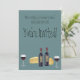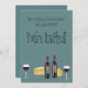 This Wine and Cheese Party Invitation, has a teal coloured background with images of wine bottles, cheese, glasses half filled...all ready to set the mood for your party! There's also a good quote about wine on the front. Feel free to customise the back of the invitation with all the details of your special night. You can change the font style to something else if you like, and the colour on the back can be altered with the colour tab if you wish something different.