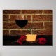 This poster features a simple image of a glass of wine, a plate of cheese and three red flowers against a rustic red brick wall.