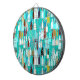 Wine bottles in a range of aqua, turquoise, earth tones and white against a turquoise blue background