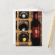 This colourful postcard features a simple still life of one upright bottle of wine next to three more bottles in a wooden wine rack. A rustic brick wall background completes the composition.