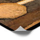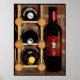 This colourful poster features a simple still life of one upright bottle of wine next to three more bottles in a wooden wine rack. A rustic brick wall background completes the composition.