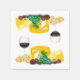 A fun and eye-catching illustration of bright yellow cheese wheels and cheese chunks in a buffet style setting which have decadent chocolate truffles; grape bunches and a glass of red wine around them.