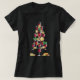 Nice seasonal t-shirt design featuring a Christmas tree made of red wine glasses, decorated with ornaments, stars and ribbons, and presents under it