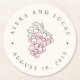 Wine country chic coasters are a perfect addition to your vineyard wedding, winery wedding or wine themed rehearsal dinner or engagement party. Design features your names and wedding date in charcoal grey, encircling a vintage etched style grape cluster illustration in cabernet plum and hunter green. Designed to coordinate with our Wine Country wedding collection.
