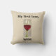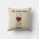 Attractive, beige, Polyester, 16' x 16', throw pillow with red wine in a glass image and funny text. Throw pillows are available in other styles, colours, and sizes.