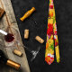 A colorful tie featuring a wine themed design with Italian wine carafe and grapes with vine and wine glasses.