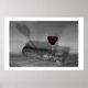 The image of a glass of sweet wine and an antique wine bottle are caressed by long dramatic shadows.
