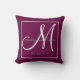 Personalised wine purple, grey and white monogrammed pillow with your bride and groom names and wedding date in a script font overlay design on a solid colour background. Elke Clarke© Makes a great gift for newly weds. Available at www.zazzle.com/monogramgallery. Makes a great gift for newly weds. Great trendy, elegant accessory for your bedroom, favourite chair, fun home decor in your family room or formal decorative addition to your living room. Other styles and colours available in our shop. Customise with your names, monogram initial and wedding date.