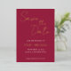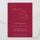 Simple, gold foil print Save the Date card with white, stylised script on wine red colour background. Edit names and date, etc, with your own information. Change foil colour if desired. Background colour may be changed as well to match your wedding colour scheme.